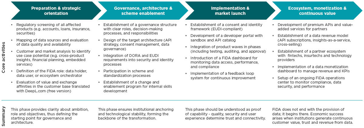 FiDA requires enterprise-wide transformation across strategy, governance, architecture, data management and monetization. To make this complexity manageable, a four-phase implementation framework is recommended that ensures momentum and synchronization.